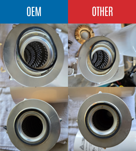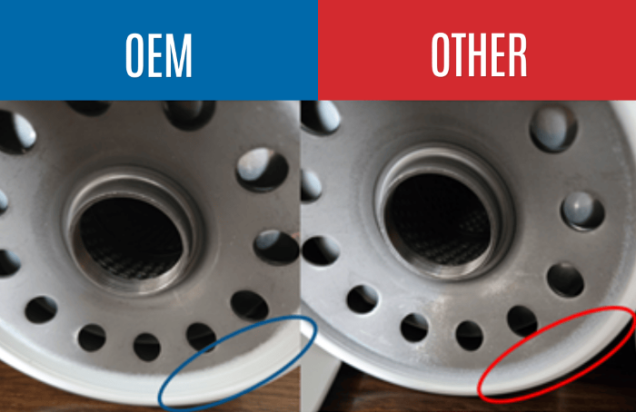 At first glance, the OEM and aftermarket filters may appear similar in size, suggesting they’re interchangeable. However, a closer inspection reveals a noteworthy weight difference, indicating the OEM filter likely uses more robust materials, thicker components, and stronger overall construction. These distinctions aren’t just cosmetic, they’re critical to ensuring long-term compressor performance, reliability, and warranty protection.